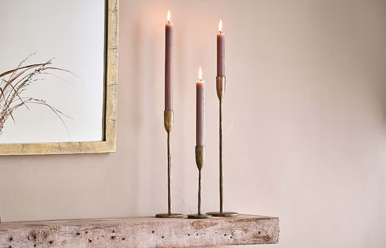 These iron candlesticks have an elegant stem and artisan looking candle holder that is well suited to a table or sideboard. The rustic finish is skillfully created during the soldering process. This affect adds to the aesthetic of the design and compliments the brass material. Mix and match heights for an attractive display. Style with our dinner candles