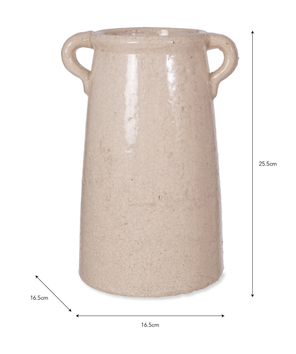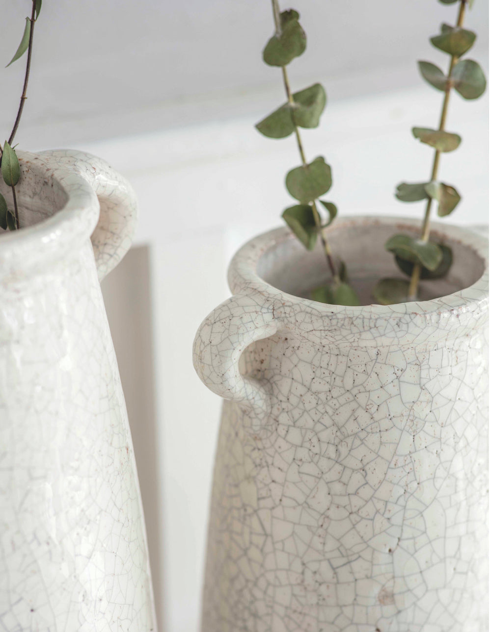With its distinctive crackle glaze this taller vase with chunky handles is a welcome addition to our  collection. Style with tall slender stems for a striking display.