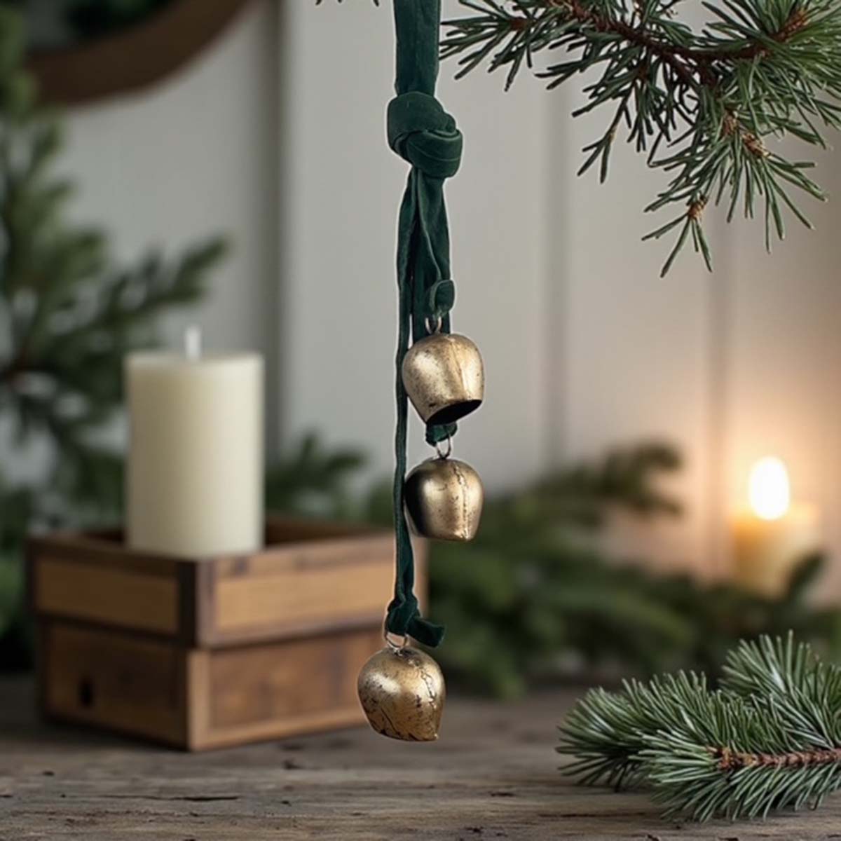 Three gold cow bells hung on dark green velvet ribbon, a great item for your festive home